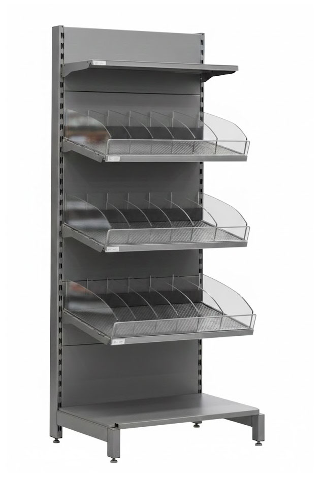 Наклонные полки: Обеспечивают отличный обзор товара и эффект «наполненности» витрины даже при небольшом количестве продукции.